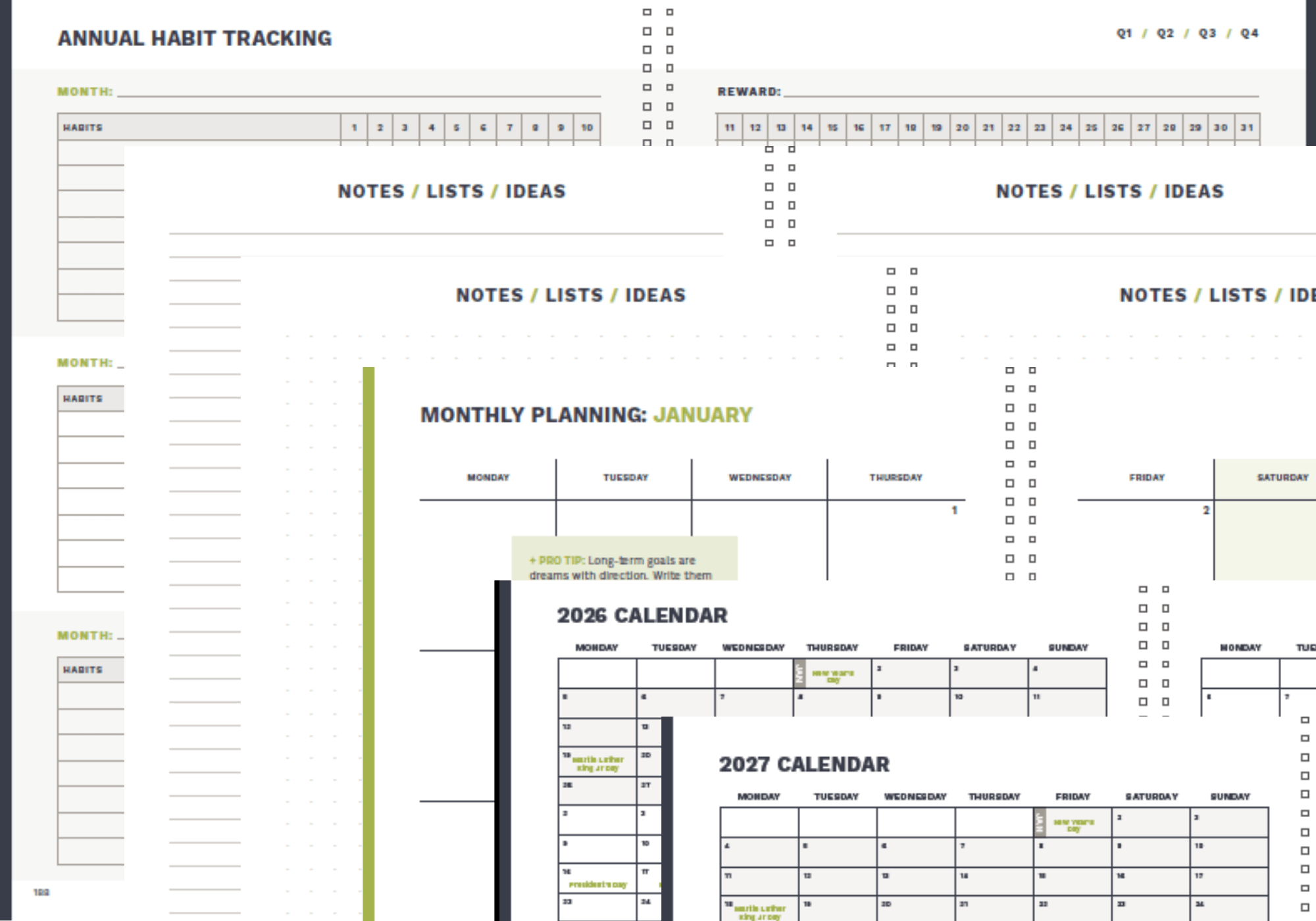 The ProAction Planner is a weekly, 12-month planner which also includes space for goal-setting, review, habit tracking, gratitude, and more.