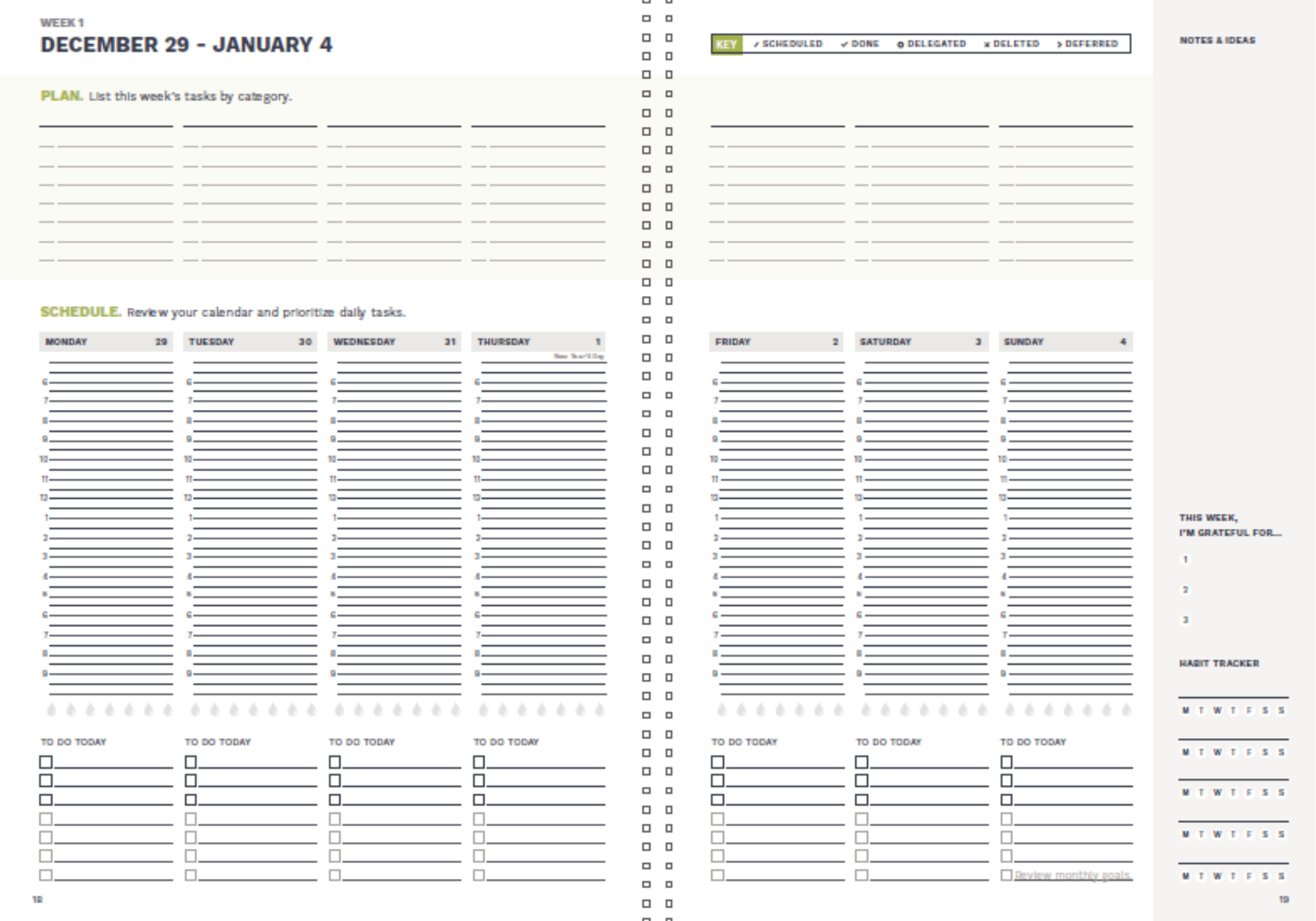 - Unique 2-page weekly layout
